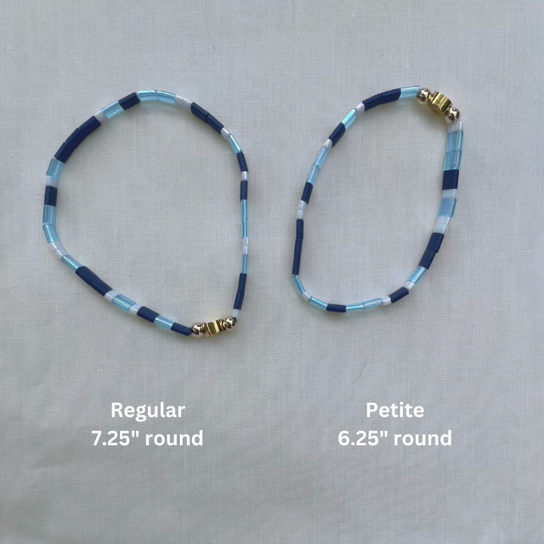 The Darby has light blue iridescent, matte denim blue and iridescent white glass beads!