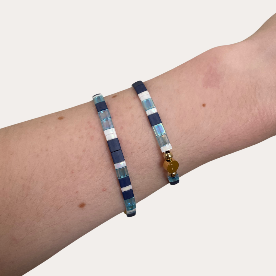 Each bracelet has a tarnish resistant 18K gold plated stainless steel logo bead and two 14K gold filled beads. It also is made with elastic to easily slip over your hand to your wrist.