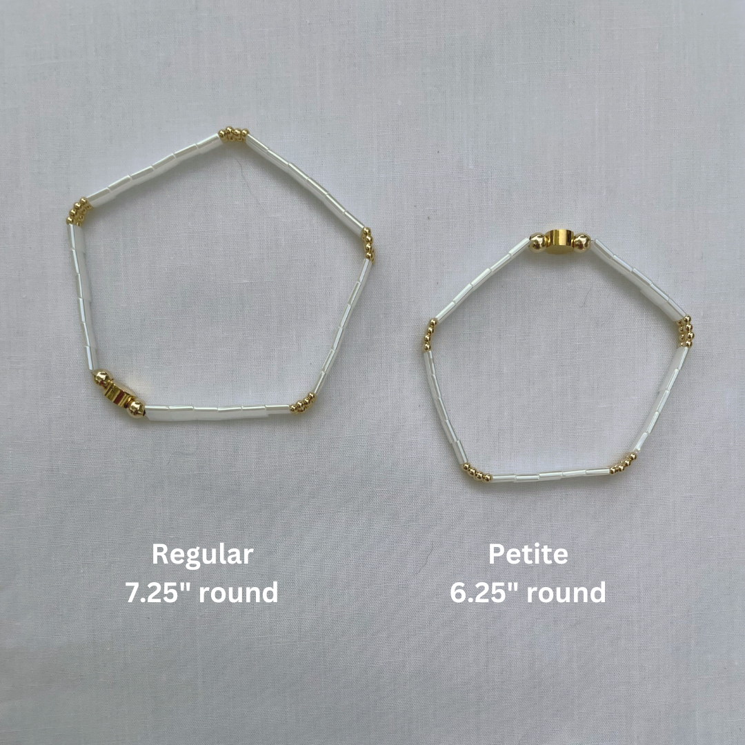 The Elizabeth is a beautiful combo of white pearl tile glass beads and 14K gold filled round beads! This bracelet is perfect to stack with our other bracelets or to wear by itself.
