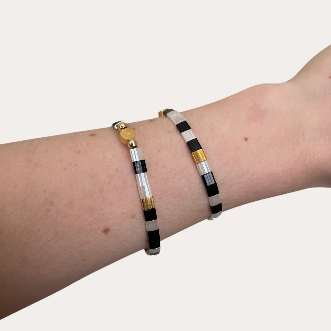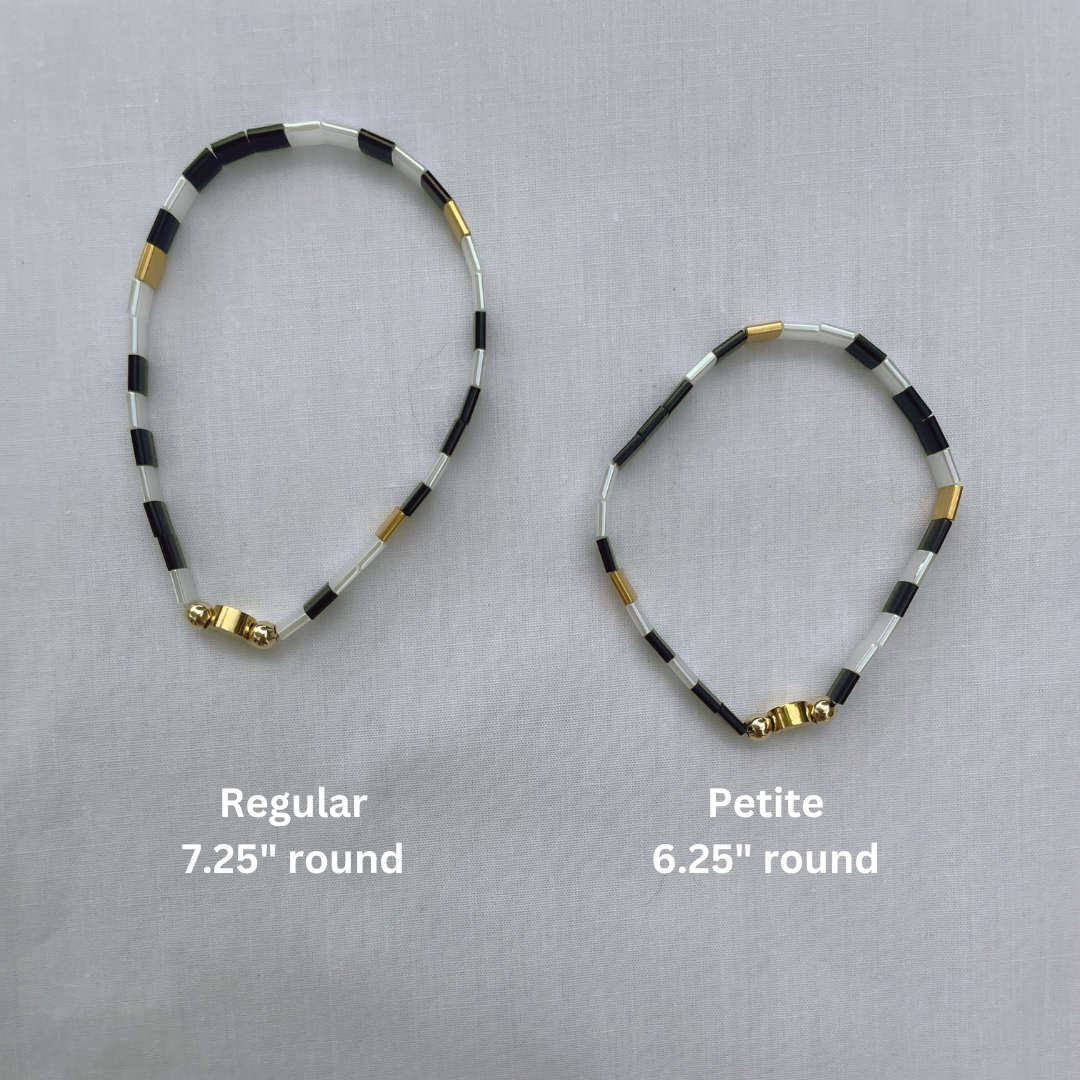 Each bracelet has a tarnish resistant 18K gold plated stainless steel logo bead and two 14K gold filled beads. It also is made with elastic to easily slip over your hand to your wrist.