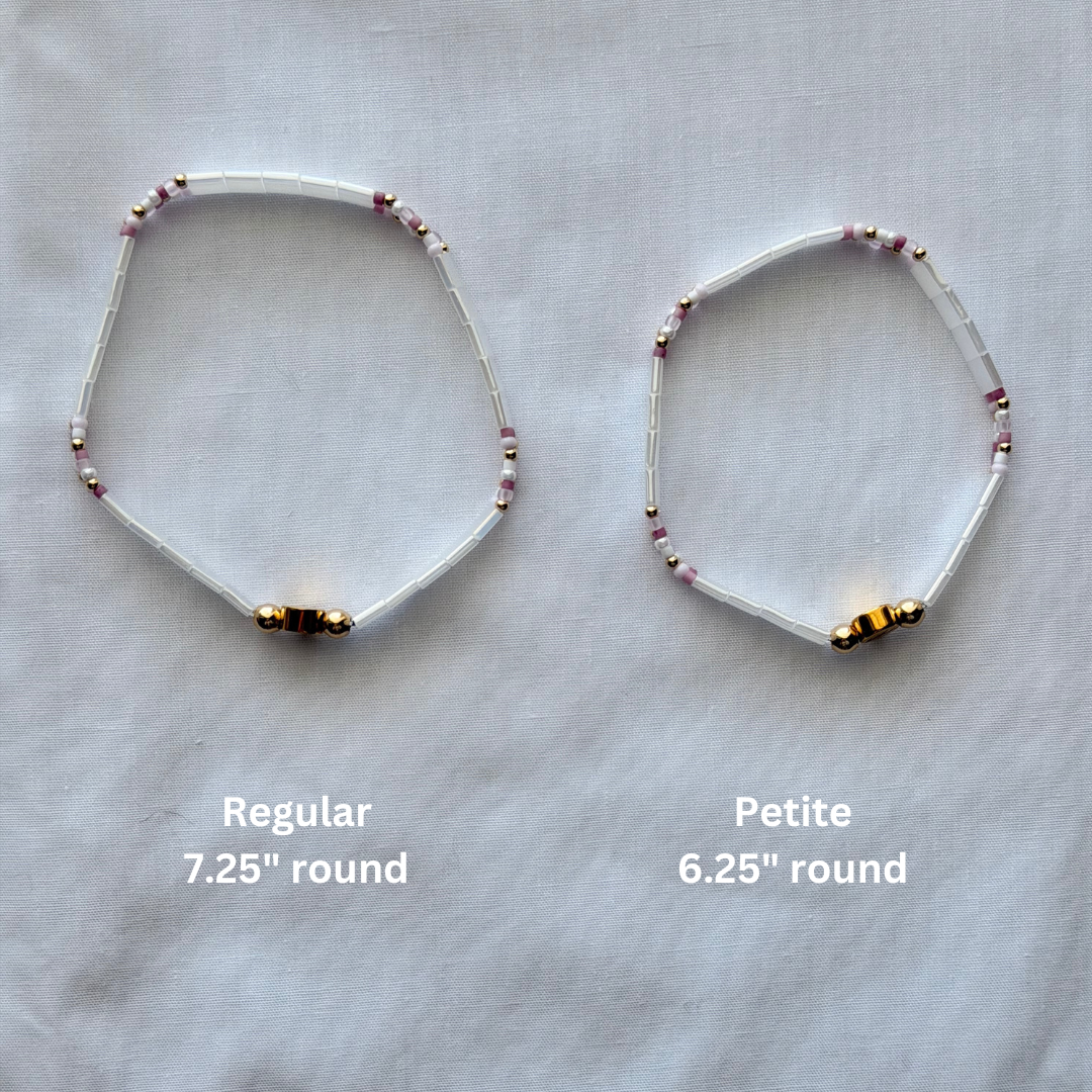 The Grace is made with white pearl tile glass beads, 14K gold filled round beads and a mix of seed beads!