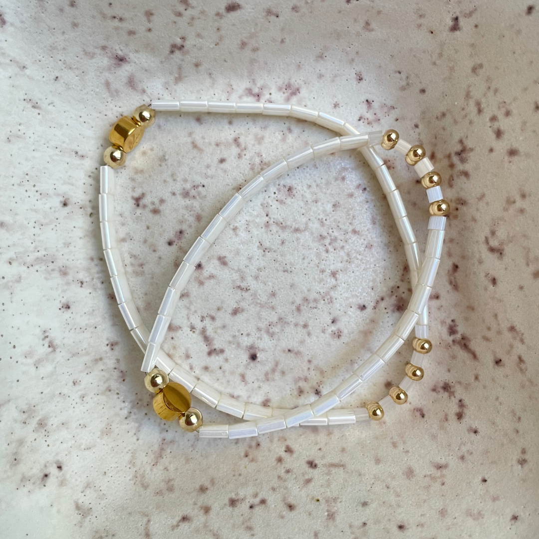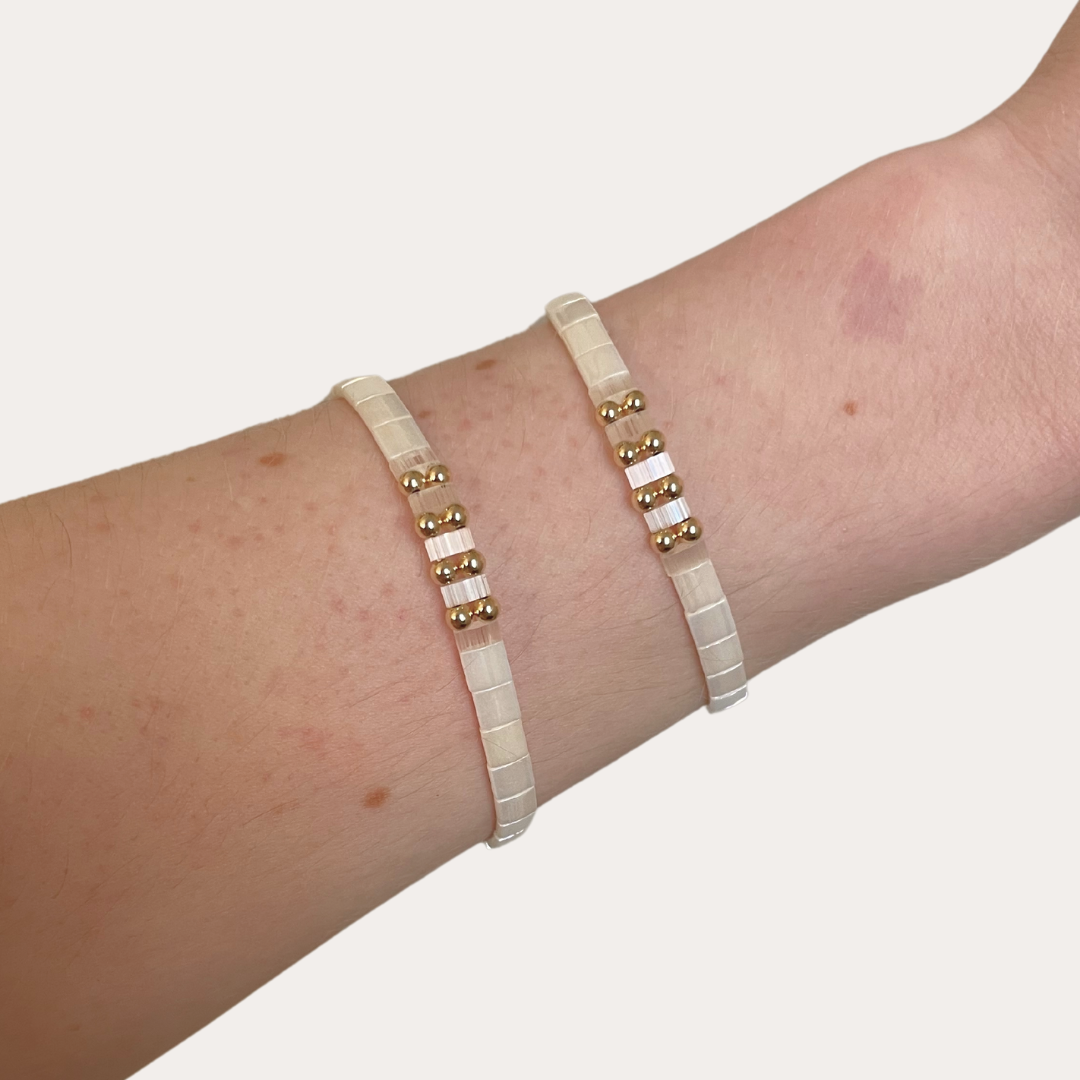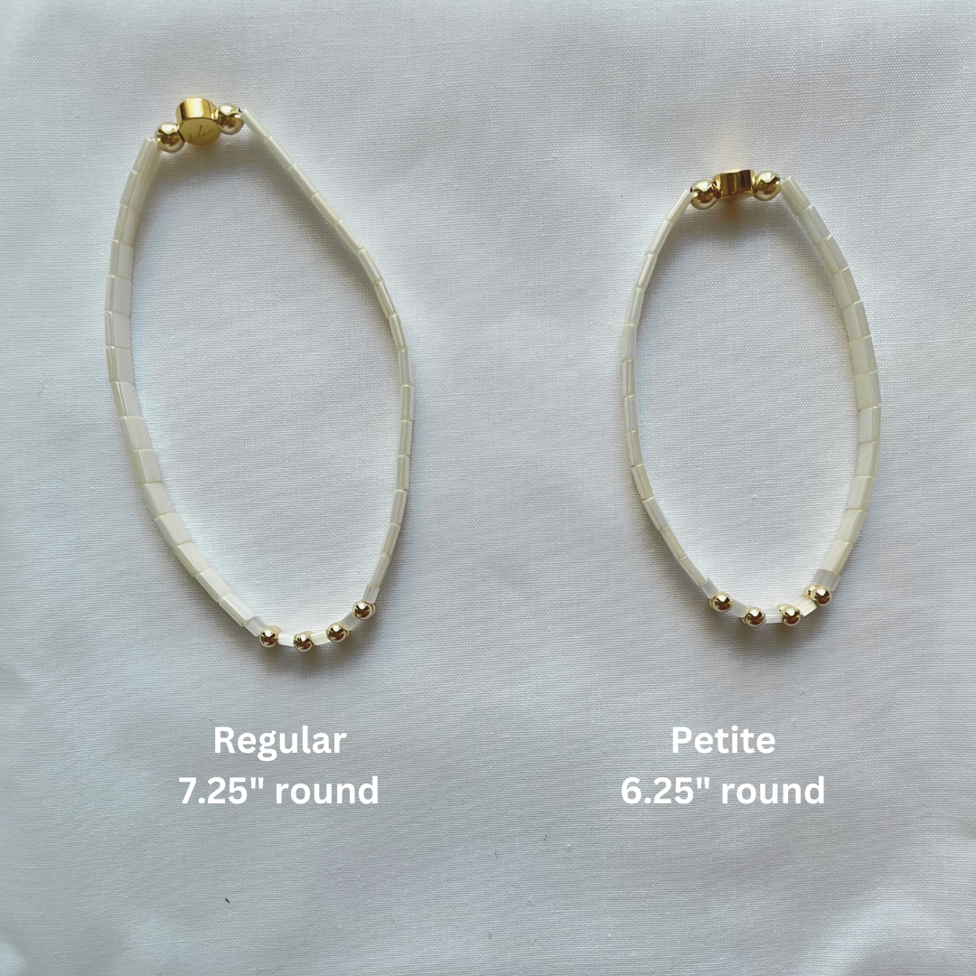 Each bracelet has a tarnish resistant 18K gold plated stainless steel logo bead and two 14K gold filled beads. It also is made with elastic to easily slip over your hand to your wrist.